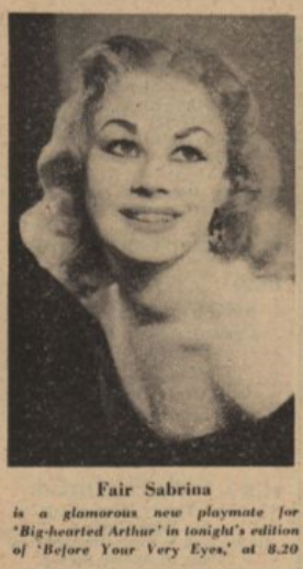 18 December 2025 Added a very nice and clean version of Goodnight With Sabrina to Youtube. 17 December 2025 Sabrina appears on Before Your Very Eyes with Arthur Askey on 4 March 1955. From the Radio Times, 25 February 1955, p.44 13 December 2025 Added the full London 1957 Pleasures of Paris programme. 28 November 2025 I have uploaded the clips of Sabrina in The Ice House to Youtube to make it easier to see them. Part 1 and Part 2. 27 November 2025 I have started converting video files so they can be viewed on Youtube. Trying to serve old AVI videos on my site has become very difficult. 19 November 2025 I'm still here, idly repairing links and HTML in the background. Please! Send new Sabrinastuff. 3 November 2025 Sabrina turns on the water in Melton, Australia 1963... maybe. Maybe 1959? It's confusing. She seems to have visited Toolern Vale in both years, but the photos of her dress and hair match both years. Which is odd. 26 October 2025 Things have been quiet here at Encyclopedia Sabrina recently, but here is an upgrade of Sabrina at the airport in 1964. 17 October 2025 A new book find which covers how Arthur Askey brought Sabrina to TV and gave her The Name. 10 October 2025 Sabrina and Paul Carpenter, with whom she appeared in her first movie (Stock Car) and was named adulteress in a 1958 divorce case brought by his wife. The case was dropped before Sabrina could tell her side of the story. Hear Sabrina discuss the trial in our interview . 9 October 2025 Another 1960s shot of a beehived Sabrina 8 October 2025 1956-01-23 8 October 2025 Just your average girl next door, in lingerie, in a garden, in a beehive. An upgraded pic.