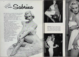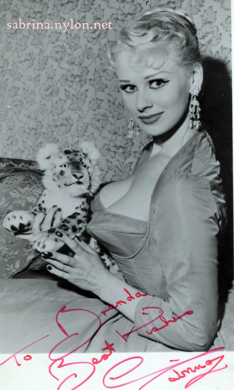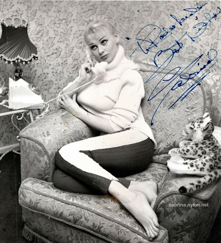 26 May 2025 After 25 years, I'm still finding new pix of Sabby. This one is from Australian Weekend magazine, 24 September 1960. 19 May 2025 Sabrina would have been 89 today. We miss you, Sabby. 19 April 2025 I've been lazy recently, but I've had some juicy new Sabrina pictures lined up for you. Please try to work out why Sabrina posed with a collection of stuffed toys on the Miniseries Picture Page. 3 March 2025 In 1958, Herb Flatow took some very dull pictures of Sabby in a New York hotel room. Here they are. 27 January 2025 It has been a long time between drinks, but I belately present a brand new set of images showing Sabrina in a gold gown. Looking superb, of course. 15 January 2025 I know you've been thirsting for new Sabrinajuice. I have been quietly stockpiling many new and interesting images that only take effort to put on the site. I'll get there. Meanwhile, here's a new and weird pic of Sabby fooling about.