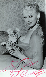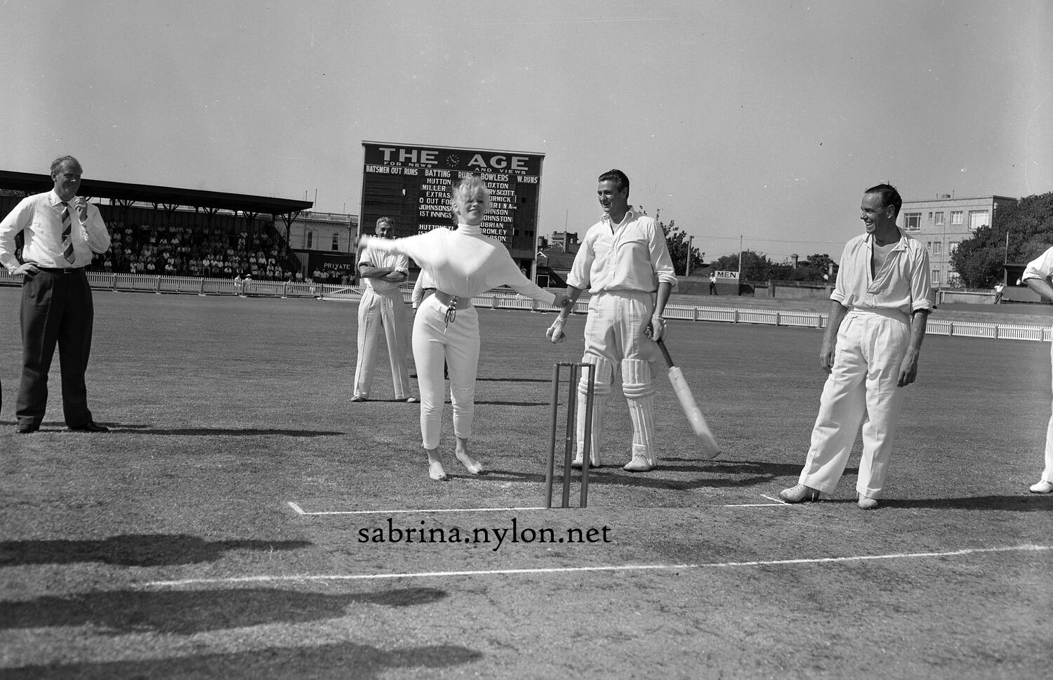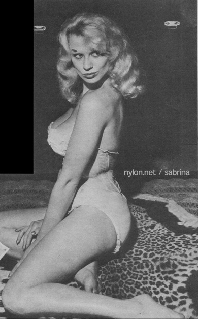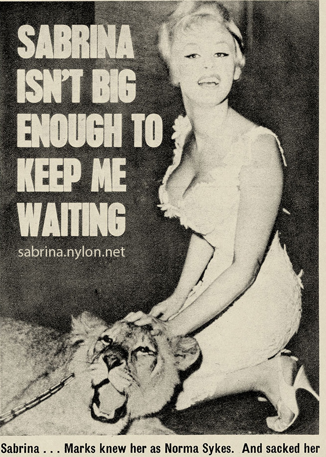 15 May 2023 Thanks to Geoff, we have three new photos of Sabby in Oz, on 18 January 1959. As he said, it was a miracle that he found them on TROVE because they were not tagged with the name 'Sabrina'. You can read about this special day of cricket in the Sabrina In Oz page. 28 April 2023 Added a reference to Sabby from Steve Sullivan's book, Va va voom : bombshells, pin-ups, sexpots and glamour girls. And a new magazine article where Sabrina extols the stylish sexy sweater. See all the magazines here. And (it's been a busy day at nylon.net) - I have a large and silent version of Goodnight With Sabrina for you to salivate over on the Sabrina Short Movies page.. 24 April 2023 A lovely new picture of our Sabrina being a bit moody and cheeky. It's amazing that after more than 20 years I am still finding new pictures of our Sabby. 14 April 2023 Sabrina and Arthur Askey - "He was always a perfect gentleman", as she told me in our interviews. 11 April 2023 Sabrina and Chico, her toy leopard. Read the related magazine article. An interesting addition to the 1961 Kavalkad magazine photoshoot. Sadly, it's full-sized. See more of Sabrina in Her Bathers. Go on. I know you want to.