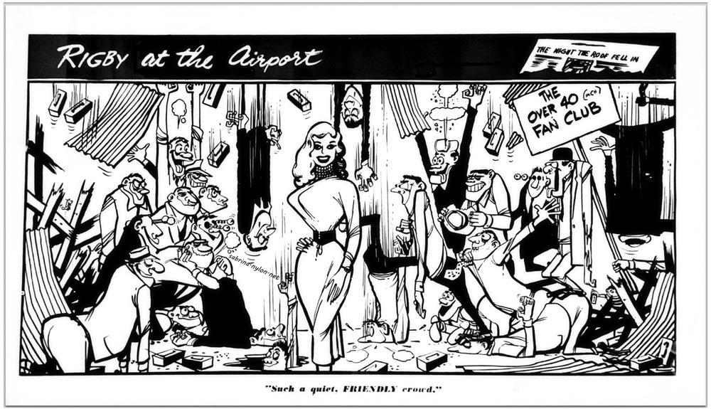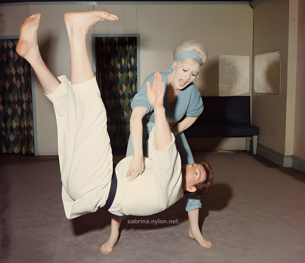 13 March 2024 Some things bug me: Donald Trump, inaccurate weather forecasts, and anal itching. But especially Sabrina pictures with no back story. Like this one: But today I may have found the why, where and when of this mystery pic. Why: to plug ITV's autumn shows: "All are scheduled to appear in shows for ABC TV are (l-r) Jeremy Brett, Diana Rigg, Ian Carmichael, Vanessa Redgrave, Francesca Annis, Kenneth More, Sabrina, Nigel Stock, Pauline Yates and Donald Churchill." Where: Hyde Park, London When: 23 September 1964 So. That's what I achieved today (2024-03-13). What did you accomplish? :-) 12 March 2024 Some colourised enhancements to the page in which Sabrina tosses Joe Robinson down. 11 March 2024 Sabrina with Barbara Roscoe and Bob Monkhouse at the Miss Venus 1956 Beauty Contest