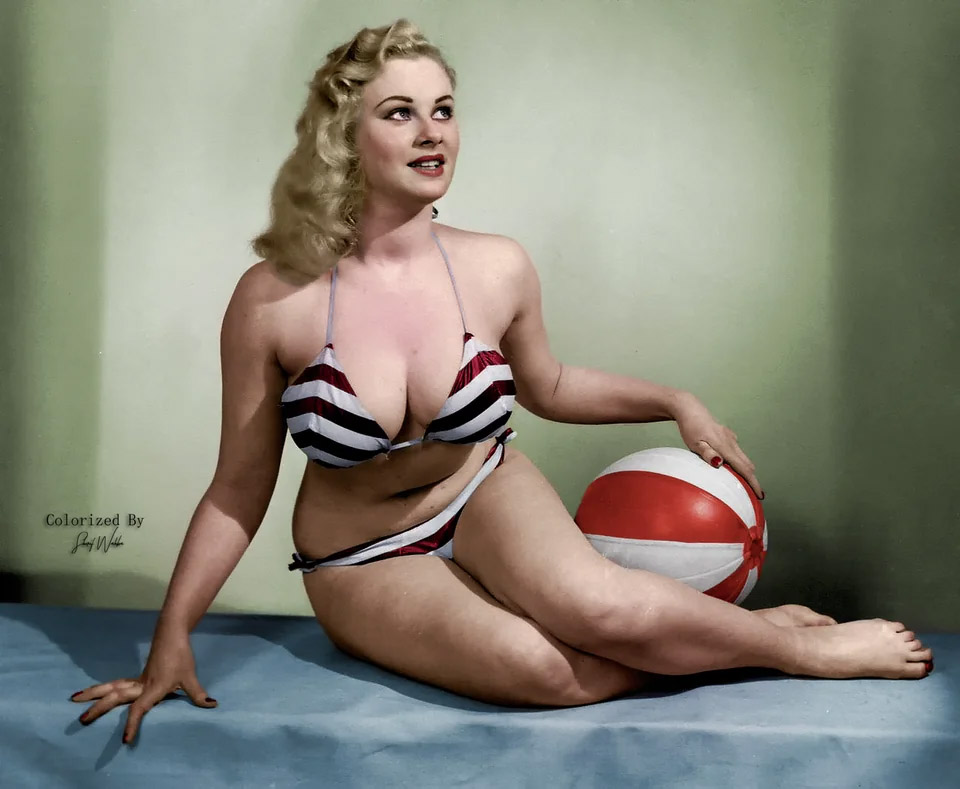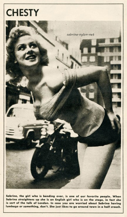 10 February 2023 In 1957, Sabrina appeared with Arthur Askey , Anthea Askey , singer Vanessa Lee , and the music of Billy Ternent in 12 episodes of Askey Galore! on radio on the BBC Home Service. Written by Dick Vosburgh and Brad Ashton, produced by Dennis Main Wilson . First broadcast - 30th January 1957 at 7pm Sabrina on radio... about as effective as a ventriloquist on radio. Remember Archie Andrews ? 30 January 2023 A lovely colourised pic of young Sabrina with her beach ball For more of the same, visit Sabrina in Bathers and Young Sabrina . Also upgraded this rather scary shot from the 1960s beehive phase 7 January 2023 I finally realised I had no idea what sort of lingerie Sabrina was wearing in her thousands of photos. I started vital research. You probably know more about lingerie than I do. Please give your expert advice . |
