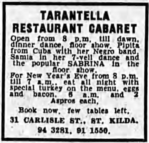 | 29 December 1962 Sabrina is appearing in the floor show at the Tarantella Restaurant Cabaret in Carlisle St, St Kilda, Melbourne