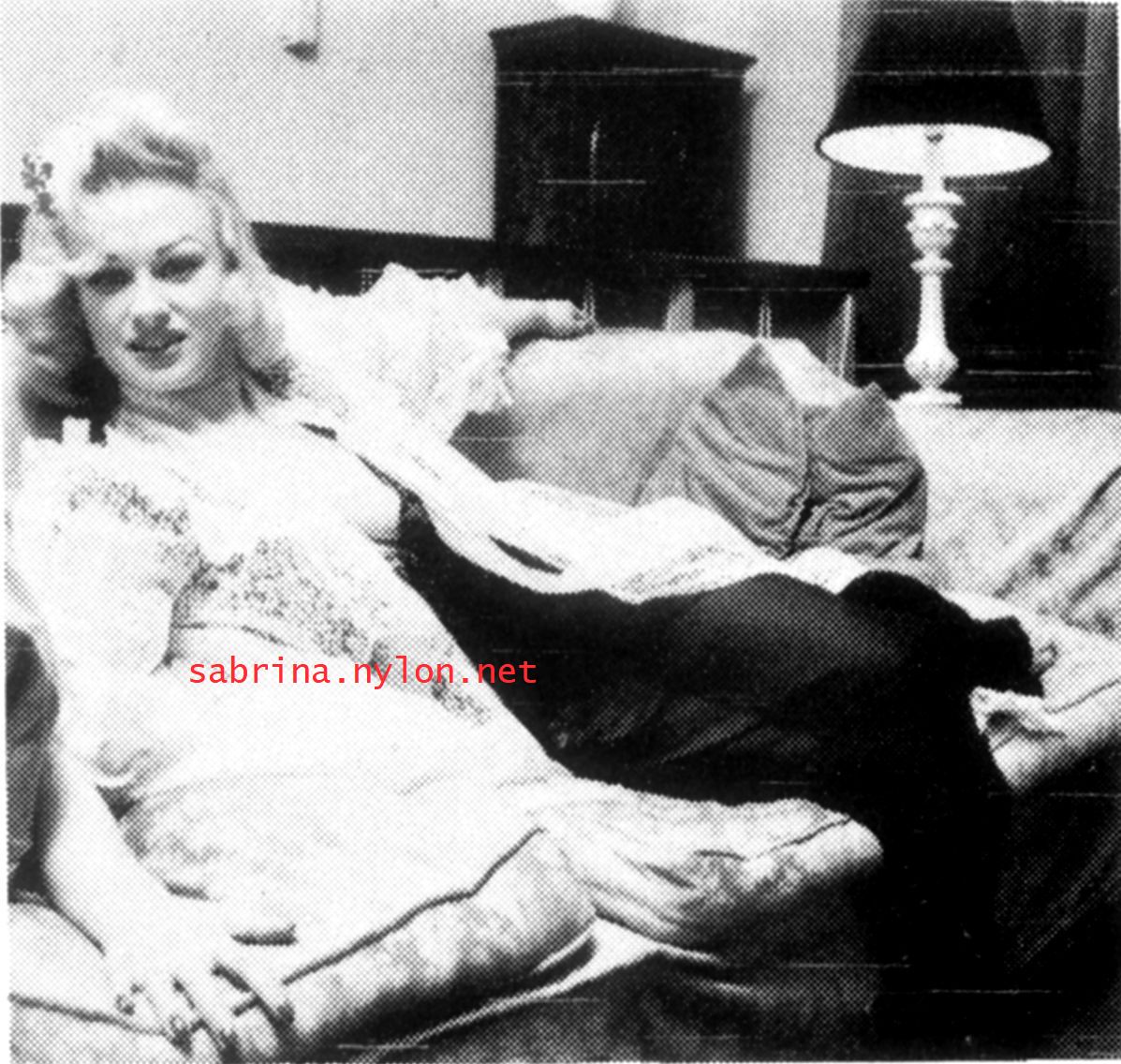 | White lace, a couch, a lamp, and Sabrina is relaxed, | |