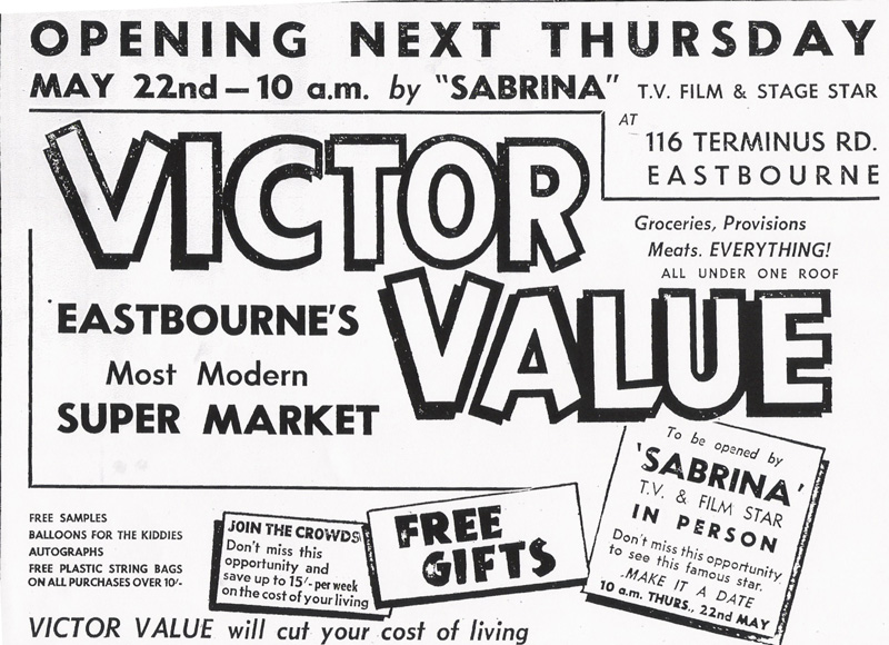 SABRlNA, who is visiting Eastbourne especially to preside at the opening ceremony, needs no introduction. Star of stage and screen, a personality known to millions of viewers on International TV, her recent success in America matched the popularity she has long established in Britain.That is the Sabrina of the lime-light. In private life she finds fun and relaxation in keen shopping and makes a hobby of studying values and comparisons in prices. “Every woman today buys with care" she told a correspondent recently. “If we have one thing in common, it is that all women want full value for money — and if it is an outstanding bargain, so much the better." When the opening formality is completed, Sabrina will visit the departments and make her own selection from the many bargains on the Victor Value shelves. A POLICE ESCORT has been provided for Sabrina the film, stage and TV star, who visits Eastbourne tomorrow morning to open the new Victor Value Supermarket in Terminus-road. Afterwards she will visit the different departments of the new store on her own shopping tour. |