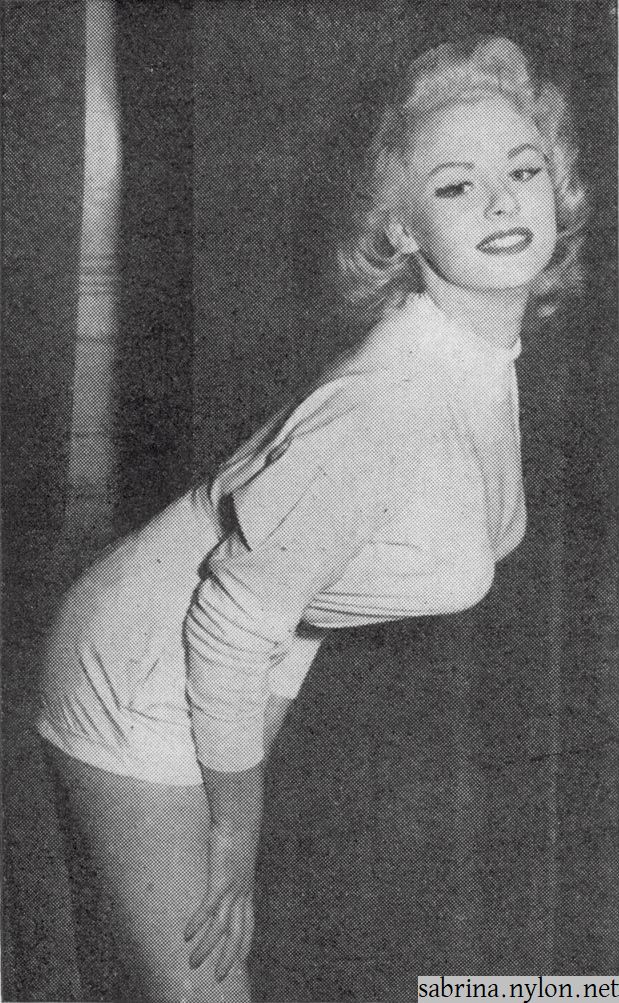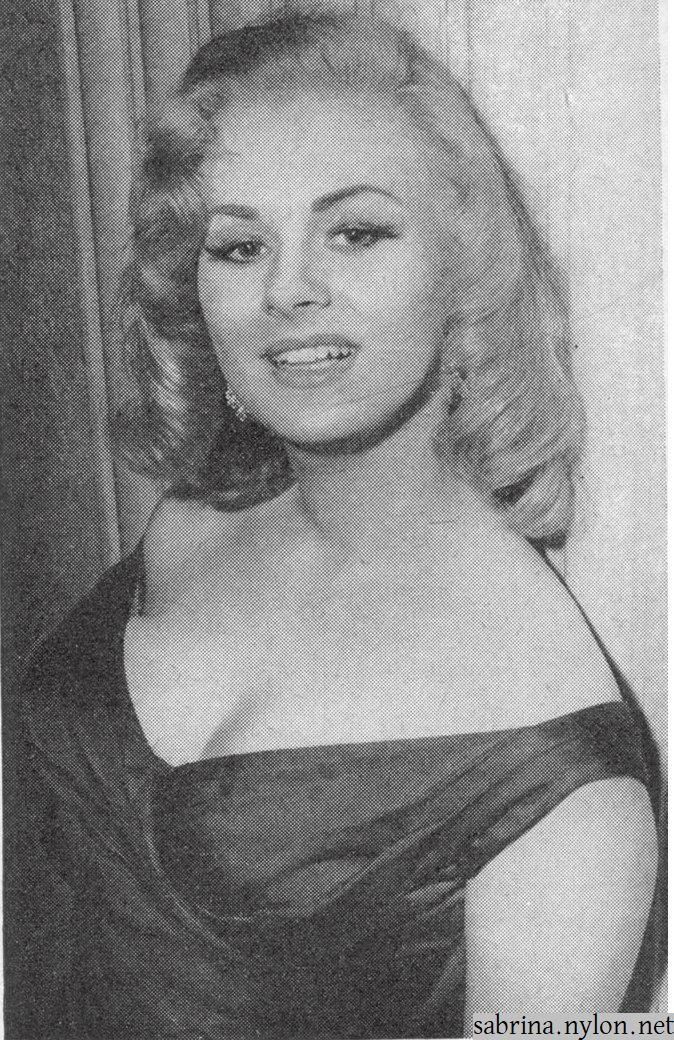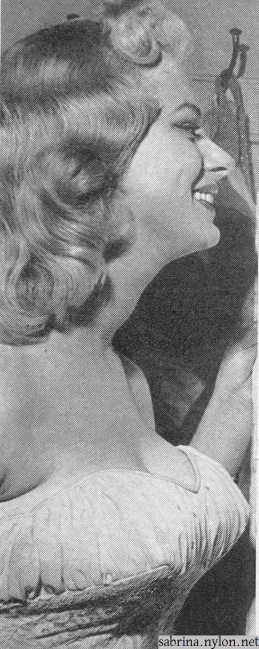 | It was at one of these modelling sessions that a photographer suggested she contacted theatrical agent Bill Watts, who has a reputation for promoting teen-age talent, and this advice was duly taken by Sabrina. Mr Watts, who obviously knows a good thing when he sees one, took one look at the lass from Blackpool and forthwith placed her name on his books. | ||