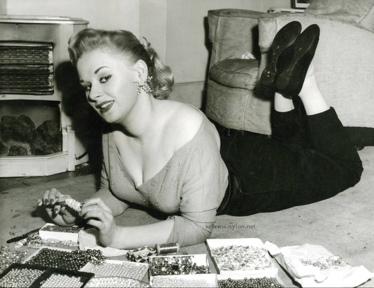 Since her meteoric rise to fame Sabrina has also acquired a new car, a mink stole and a costume jewellery factory. Designing costume jewellery has long been a hobby of Sabrina's, and one of the less discussed activities of this much discussed young lady is her frequent trips to a home for disabled girls, where she instructs the inmates in the art of designing and making jewellery. Herself a victim of polio for four years, Sabrina knows only too well how time can hang heavily on the hands of those confined to bed and wheel-chair. |