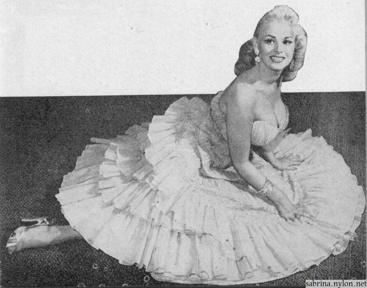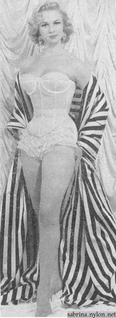 | It might well be said of Sabrina that she is the girl who has launched a thousand shops. Her personal appearances have been many - ranging from presenting prizes at a Garden Fete to opening a furniture store in Leeds. On the latter occasion there were so many people eager to catch a glimpse of the girl with the figure that sets men gasping and girls reaching for the exercise chart, that mounted police had to be called out to control the crowds. | ![]() |