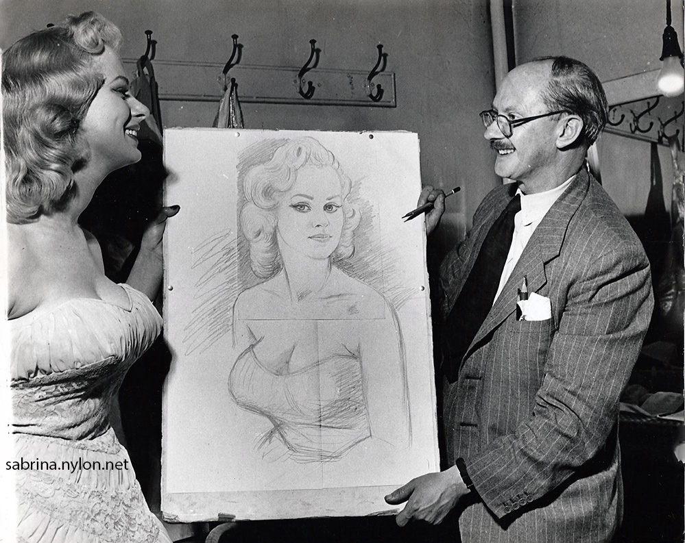Sabrina has indeed travelled a long way since those early days - from pictures in men's magazines to a picture in the Royal Academy. Her portrait, painted by the famous cartoonist and artist, W.M. Hutson ( Hut ) is a possible for this year's Academy. 31 Dec 2012 - Hut's grandson, Jonathan, sent a great photo of Hut and Sabrina and the portrait! |