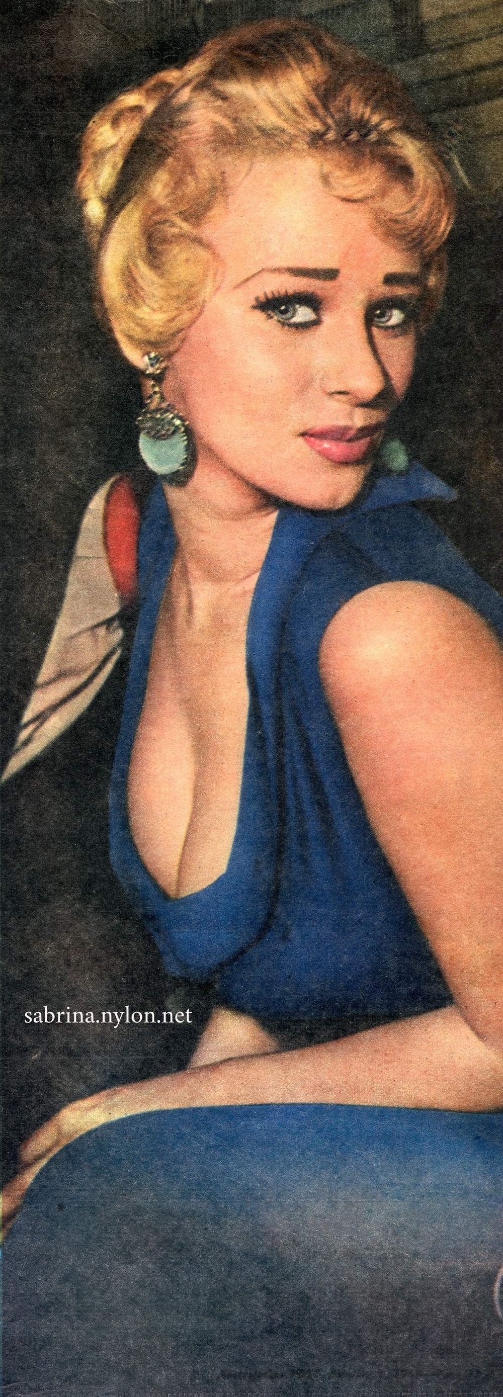 Giving the lie to such nonsense, the fabulous Sabrina statistic, her vehicle to fame and fortune, was on open display to the crowded room. Framed in a zoomingly low cut black faille gown, as a jeweller shows his costliest diamond, it was a magnet that held every male and female eye.