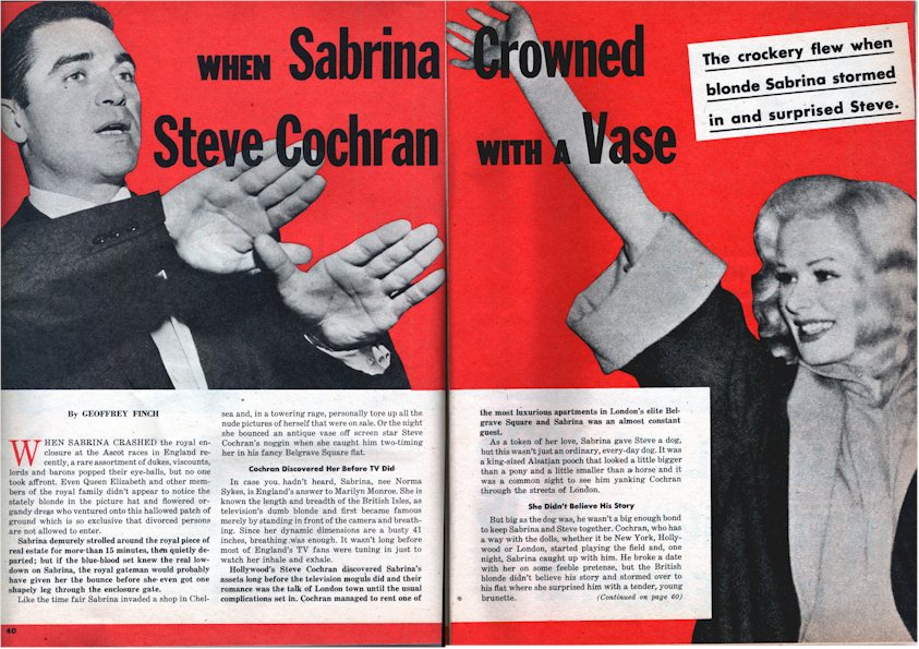 When Sabrina Crowned Steve Cochran With a Vase The Crockery flew when blonde Sabrina stormed in and surprised Steve. By GEOFFREY FINCH WHEN SABRINA CRASHED the royal enclosure at the Ascot races in England recently, a rare assortment of dukes, viscounts, lords and barons popped their eye-balls, but no one took affront. Even Queen Elizabeth and other members of the royal family didn't appear to notice the stately blonde in the picture hat and flowered organdy dress who ventured onto this hallowed patch of ground which is so exclusive that divorced persons are not allowed to enter. Sabrina demurely strolled around the royal piece of real estate for more than 15 minutes, then quietly departed; but if the blue-blood set knew the real lowdown on Sabrina, the royal gateman would probably have given her the bounce before she even got one shapely leg through the enclosure gate. Like the time fair Sabrina invaded a shop in Chelsea and, in a towering rage, personally tore up all the nude pictures of herself that were on sale. Or the night she bounced an antique vase off screen star Steve Cochran's noggin when she caught him two-timing her in his fancy Belgrave Square flat. Cochran Discovered Her Before TV Did In case you. hadn't heard, Sabrina, neé Norma Sykes, is England's answer to Marilyn Monroe. She is known the length and breadth of the British Isles, as television's dumb blonde and first became famous merely by standing in front of the camera and breathing. Since her dynamic dimensions are a busty 41 inches, breathing was enough. It wasn't long before most of England's TV fans were tuning in just to watch her inhale and exhale. Hollywood's Steve Cochran discovered Sabrina's assets long before the television moguls did and their romance was the talk of London town until the usual complications set in. Cochran managed to rent one of the most luxurious apartments in London's elite Belgrave Square and Sabrina was an almost constant guest. As a token of her love, Sabrina gave Steve a dog, but this wasn't just an ordinary, every-day dog. It was a king-sized Alsatian pooch that looked a little bigger than a pony and a little smaller than as horse and it was a common sight to see him yanking Cochran through the streets of London. She Didn't Believe His Story But big as the dog was, he wasn't a big enough bond to keep Sabrina and Steve together. Cochran, who has a way with the dolls, whether it be New York, Hollywood or London, started playing the field and, one night, Sabrina caught up with him. He broke a date with her on some feeble pretense, but the British blonde didn't believe his story and stormed over to his flat where she surprised him with a tender, young brunette. Sabrina gave Steve a dog - and a wallop! Sabrina picked up the nearest thing at hand, an antique vase, and hurled a perfect strike, the vase bouncing off Steve's head and smashing to smithereens on the carpet. Cochran, who had been feeling no pain up to that time, thanks to a half bottle of scotch, moved in to counter attack and landed a couple of slaps, but Sabrina held her own in the in-fighting. The battle wound up in a draw - with the hefty, chesty blonde departing in a huff, leaving Cochran with a headache, a busted vase, and a new girl friend. The next time Sabrina visited the actor's apartment, she made it plain that she had only come to see the dog. To prove he was not a fellow to be brushed off so lightly, Steve attended a formal dance a few nights later and turned his back on Sabrina every time she came near him. His indifference might have made an impression, if he hadn't already been Topic A of the party. In addition to being quite drunk, Steve was wearing tails, a white tie, a Sherlock Holmes hat and large riding boots. When Cochran was leaving the country, Sabrina was ready to forgive him and even came to the airport to see him off, but Steve never forgot that bump on his head. Although his flight was delayed 45 minutes, everybody on the plane disembarked except the actor and his dog. They stayed put, even though Steve was told Sabrina was waiting. Her only comment was, "I just came to see the dog off." But now that Sabrina has rubbed elbows with royalty at Ascot, even the dogs she pets have to be blue-blooded - and as for Steve Cochran, he's just another commoner in her book.