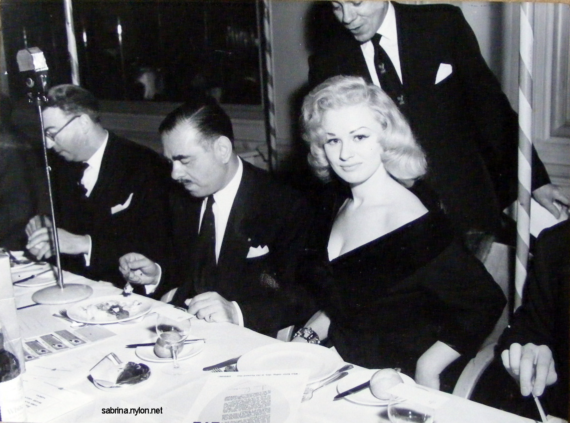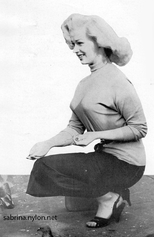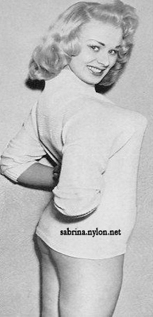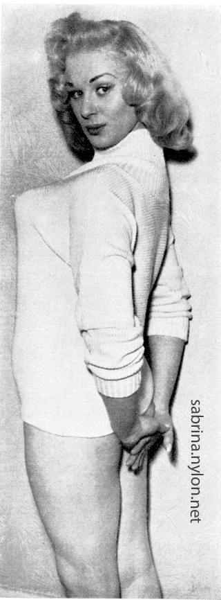 Some of her quotes have been repeated over and over in England. There was, for instance, the time when Sabrina was asked to play Lady Godiva at a town festival. Sabrina was at first flattered to play the role of the legendary blonde who rode through Coventry on a white horse. On one occasion a film producer took her for a quick business lunch to a restaurant noted for speedy service, and told the waiter they were in a hurry. Norma Sykes' persistance [sic] to formal education is very open and pronounced. "Marilyn Monroe made a fool of herself with books," opined Sabrina recently. "She's perfect just as she is. Men don't like a cultured woman. They like them dumb as dumb, and I'm too smart to be anything but dumb." To prove her words, she abandoned a course of Shakespeare, which she had started with the intention of becoming a dramatic actress. Sabrina also abandoned, somewhat more reluctantly, a course of singing instruction by Maestro Mario, famous British impresario. When Sabrina went to him for lessons, the bespectacled little man with the ginger toupee tried valiantly for several weeks. Finally, he announced plaintively, "This girl's voice covers a range of exactly three notes. How can I teach a girl to sing songs with just three notes?" And truly Sabrina is loved by her mama, who is especially up in arms about those nude playing cards. Mrs. Sykes says: "I'm worried about the effect the pictures will have on my daughter's career. They were taken when she was an inexperienced girl and it's shameful that she should be exploited and held up to ridicule." Perhaps the most amazing thing about this British goddess of glamour is that she is somewhat of a medical miracle. Only three years ago at the age of 16, she was still learning to walk. She had four years in the hospital as a bed-ridden polio victim and still carries the scars of a leg operation that was nearly an amputation . But today she has blossomed in every Briton's idea of twin-peaked perfection of burgeoning womanhood. The unknown girl who signed nude model releases for photographers at three dollars a time is now in £1200 a week bracket! The name Sabrina was the brainchild of leading British comedian Arthur Askey. He needed an outstanding girl to appear on his TV show and picked Norma, a well-built unknown who had just made the cover of Britain's top magazine, Picture Post. Askey intended to revive the one-time burlesque gimmick of silence — every time the girl opened her mouth the band would blare up, or the scene-shifters get noisily to work behind the backdrop. The gimmick caught on and received terrific applause. The press began an intensive campaign of speculation. Would Sabrina ever speak? Could she speak? With such an overflowing bodice, was it even advisable? Askey hit on the name Sabrina , from Milton's 17th Century poem: Sabrina fair, Afire with the creative emotion of the artist, stage-wise Askey told Norma about the name that was going to make her famous, a one-name accolade usually reserved for ballerinas and head waiters. Sabrina's reaction: "Sounds a bit silly to me." But the gag-weary press was for once tickled and intrigued. On the night of her first television appearance, a dozen critics descended on Sabrina five minutes before the show was due to begin. But dumbness alone has not been responsible for the Sykes girl's fabulous success. Her outstanding sexual attributes, like Caesar's wounds, are dumb mouths speaking eloquently for her. Famous British photographer Alex Stirling, whose shots of the unknown Norma had first caught Askey's eye, says, "I was shown a little amateur snap of a girl, and immediately cabled asking her to pose for me. "When she arrived at my studio, I knew I had found an odds-on winner. Apart from her obvious physical well-being, there is something about her that draws a man the way a flower draws a bee. Call it a smell if you like — a pleasant smell that draws like an erotic magnet. Odysseus must have been drawn by just such a syren as Sabrina. and only prevented his downfall by tying himself to the mast of the Argo." Soon after her first astounding success on television, the BBC asked Sabrina to open their new studios at Marylebone, London. Bigwigs and dignitaries lined up for the ceremony, scheduled for noon. Sabrina arrived at 2.40 p.m. — nearly three hours late. She stepped sedately from her cab, wiggled up the steps before the silent gathering, and remarked brightly, "I hope I haven't kept anyone waiting?" After a few months in the Askey show on television, Sabrina was dropped. There were complaints that Sabrina had added a swelled head to her other swelled attributes. Askey himself was non-committal. Then she had a tiff with the BBC, who asked her to go north to appear in a show. "They sent me a third-class ticket," Sabrina huffed, "and expected me to get to Manchester for rehearsals two whole days before the show opened. Imagine, two whole days rehearsals and I didn't have a line to speak." Some people in the world of entertainment are amazed that Sabrina did not die a natural death within a year. Anyone who has treated agents and producers as slightingly as Sabrina, they say, usually ends up getting the cold shoulder. Critics say she has developed temperament in unnecessary quantities. She landed a part in a film but was again dropped for failing to keep appointments. The camera technicians were just as disappointed as the executive, but for different reasons. On the set, Sabrina provided them with a pleasant problem—how to keep both front and back of her in focus at the same time. "It's at least a couple of paces," remarked one cameraman laconically. Director Wolf Rilla, arranging cast positions for a scene in "Stock Car," stared at Sabrina then complained seriously to the focus-puller, "She's too far forward, or something." Sabrina launched herself in music halls last year at the Chiswick Empire in London. First, she came on stage in a red gown, and smiled. Later, she m