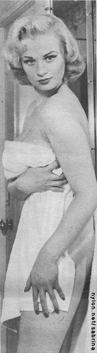 The institution of the Beautiful Dumb Blonde was founded in America, developed in America and finally abandoned in America. Our greatest contributions to the institution are now gone - Harlow to the peroxide beyond, Turner and Grable alive but passé, Monroe turned egghead and Novak becoming a serious actress. (Mansfield is making too much money to qualify in the "dumb" category any more.) It is ironic indeed that Sabrina, the newest in a long line of BDB's is, of all things, English! With Sabrina as a front runner, Britannia is keeping alive the institution. Born Norma Sykes, Sabrina made her first au naturel appearance 22 years ago, and has spent the last three personally responsible for the sharp rise in video sales in her native land. The reason for Sabrina's success on TV is readily apparent - her bust - it measures an incredible 41½ inches. Sabrina has frontsided her way to fame on the theory first set forth by Oscar Wilde (whom she has probably never heard of) that it is OK what people say about you as long as they say something. She thrives on hoopla. Take for example her well publicised gesture of retrieving all the playing cards on which she appears nude, showing a fetching side view of her chest (taken when it was a small 39). Monroe lives with her calendar past; Ekberg is noncommittal on her statue past. Sabrina and her cards, by contrast, proved good for many columns of tabloid copy and many, many pictures. Queen of the Press Release, or Monarch of the Mammaries - Sabrina is both. CIRCLING ORB with her own lovely orbs, England's Sabrina is clicked at London airport, with actor Steve Cochran in Bavaria. AMPLY DEMONSTRATING that she has more than just a bust, Sabrina in lacy undies displays sultry, intoxicating statistics. More globe-hopping is seen as she steps chestily from car in France, [I believe it's actually her at Ascot in 1957 - Ed] as she titillates Italian press with her sexy blood-warming cheesecake in Rome hotel.