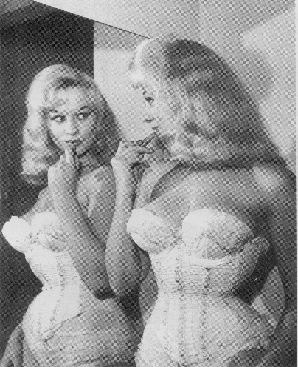 Mr. Cool could look for many years and never again discover a beauty so perfect as that of Sabrina, so when Furia, the photographer, brought these to our attention, we paid the price and here are the only cheese-cake shots of Sabrina on this continent. (And a similar pic not included in the Mr Cool article) Sabrina is England's top glamour girl. She is the girl with the amazing proportions namely 41 1/2-18-36. She is a blue eyed blonde, weighs 128 lbs, and stands 5 ft. 6 in. tall. She has appeared in 6 top motion pictures in England and is also a top Nite-club star in England as well as having worked in many of the leading nite spots on the continent. She appeared as the star of the revue "Pleasures of Paris" when it played in London and toured with the play in Australia for a year. She is also the top glamour girl of British Television, and has appeared on many top TV Shows in London. Sabrina has all of her clothes custom made due to her amazing measurements. She also has a difficult time finding belts small enough for her 18 inch waist. She is looking forward to doing Motion Picture work in Hollywood, and has also had offers for Nite club appearances in Las Vegas. |