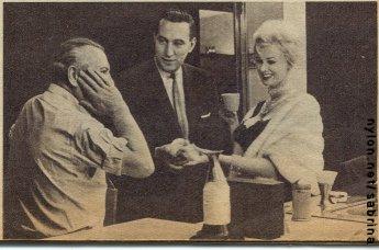 Australians were impressed by Sabrina's talents when she came here but Americans were downright awe-struck when the buxom British blonde bounced ashore on Manhatten Island. Once they got their breath back, though, they registered exuberant admiration, and when Sabrina, with an escort, went out to see the sights, she found that she herself was classified as one of the sights that just had to be seen. the aquarium's walrus tried to crawl into her lapHer New York triumph began with a visit to Coney Island, where the aquarium's walrus tried to crawl into her lap. Then she appeared in a swimsuit, and life-of-the-party beach-types turned handsprings. Some of her admirers cheered, others were content to stand and stare. After a swim, Sabrina called for strong tea. A boxer who took his eyes off his opponent to wink at Sabrina was knocked out That evening, she went to the fights, where the fans greeted her with appreciative stamping and whistling. The star told her escort, "I think it's a brutal sport, but I love the boxers." The boxers loved her - especially Al Milone, who kept looking her way and winking, until he was knocked out in the fifth. I don't want them to touch me, thoughShortly afterwards, Sabrina was swept away to a steak-and-champagne supper at the Round Table nightclub, where her round table quickly filled with men. Asked how she felt about creating a riot wherever she went, Sabby explained, "If men want to whistle and stare as I walk by, that's perfectly all right. I don't want them to touch me, though . If their outbursts are expressions of approval, I think it's wonderful." Despite fervent outbursts of approval from the gentlemen at the Roundtable, however, Sabrina concentrated her attention on another boxer - the owner's dog. She finished dinner with this boxer's nose resting on her shoulder. he hit two other cabsNew York's last tribute for the night came from a cab driver, who said he wouldn't dream of charting to drive Sabrina home. he had some difficulty keeping his eyes on the road on on the way to Sabby's hotel he hit two other cabs - but only grazing bumps which did no damage but which vastly improved Sabrina's acquaintance with the American argot.