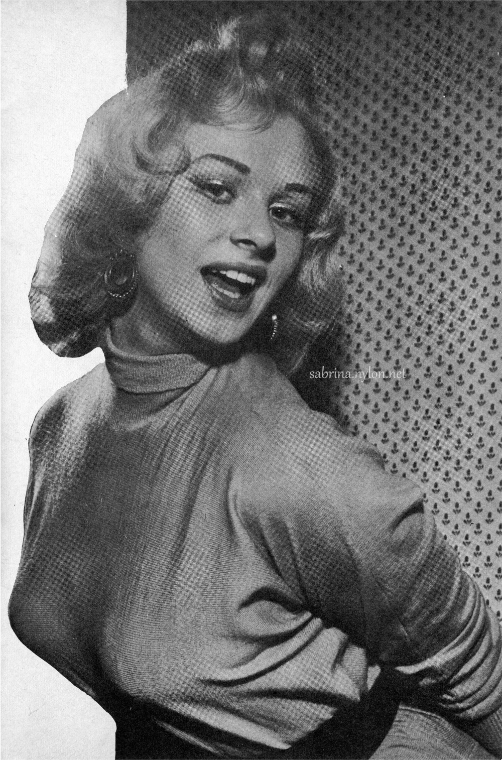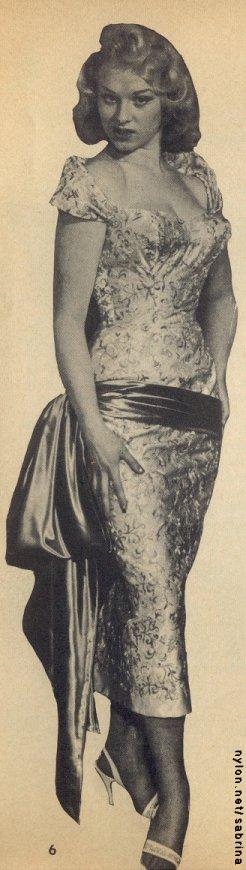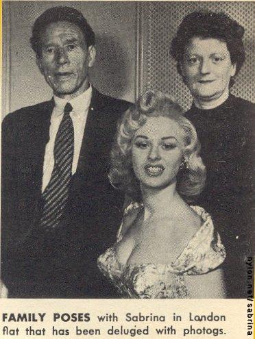 Norma Sykes, a young British lass, has taken her sinfully beautiful figure and a golden silence to get just what she wants - a career as "Sabrina" on TV and the stage. right now, she has made herself just about the hottest thing the English public has had to talk about since Guy Fawkes tried to blow the lid off the house of Lords. A year ago, no one had ever heard of Norma Sykes. She lived in an obscure mining town of Wales [so obscure that she never lived there - Ed.] where there was not much hope of her being magically discovered. She packed a bag one weekend and took the trip to London. There an agent spotted her and got her to appear for one brief instant on a TV show. Norma, or Sabrina as she now called herself, said absolutely nothing on the show. She just looked. The TV station was deluged with phone calls and letters wanting to know who the "Silent Sabrina" was. In no time at all, Sabrina was christening boats, cutting ribbons at new bridges, opening hospitals and appearing at London first-nights. Her schedule became as full as the Queen's. She couldn't make a gesture without full newspaper coverage. Now, Norma Sykes has brought her parents to London, and there in a West End flat she receives the press and displays her famous curves. But Sabrina has still not uttered a word in public. Whatever she may say at home is strictly off the record. Her act is simple. She merely appears, looks ravishingly beautiful, stuns everyone who gazes at her, smiles prettily - and that's it. It is a golden silence that has been paying off in the Pound Sterling. Sabrina's eventual ambition is to become an actress. To