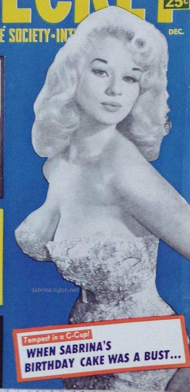 And the next day, when you open your newspaper to the gossip columns, or the picture section, Sabrina's name and/or frame pops out at you. In short, the gal who captivated Great Britain when nature made mountains out of molehills, is trying to imitate Jayne Mansfield and get her points across to the American male, the man who hardly ever looks up when he can look down. Of course, being so indiscriminate about her pendulous public appearances can lead to embarrassing incidents, even for a gal who has made it DOUBLY plain that she would be pretty difficult to embarrass. There was the private little party somebody of no consequence held for the daring doll the other day in one of Manhattan's hotels. A nice, big, gay birthday hit where Sabrina could make an impression on the Boys. Naturally. Sabrina and her manifold charms showed up. SHE CAME, SHE LOOKED—AND SHE WALKED RIGHT OUT! That startled hell out of the Show Biz bindlestiffs who figured the dame would do ANYTHING for a laugh and attention. But even saucy Sabrina just couldn't take the cake that had been baked for the party It was a very big cake it almost looked like TWO cakes. Because rising on either side were two, huge cone-shaped decorations, each of which had been topped with a bright red cherry! You get the picture? That cake Looked as if Sabrina had stretched out and modeled for the baker — it had her symbol(s). But the blonde bomber didn't like it at all and stormed out. PAST IMPERFECT The whole joint was laughing when somebody asked sarcastically how come the bold babe was suddenly turning prudish. Did she somehow forget her past — and all the sinsational success she had achieved back in Merrie Olde England with naughty, but ever so nice, nudity not so long ago? Some nudie photos of the daring doll, showing what every man imagines he can see when he crowds in close, got tremendous circulation in Great Britain after saucy Sabrina made her mark on the public there as a Big-Big TV star.