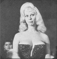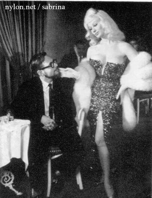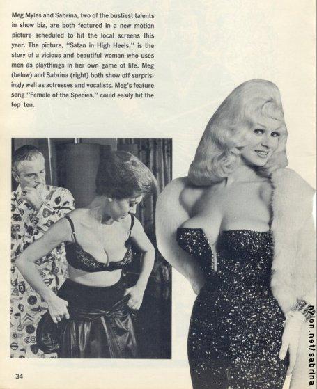 'Meg Myles and Sabrina, two of the bustiest talents in show biz, are both featured in a new motion picture scheduled to hit the local screens this year. The picture, "Satan in High Heels" is the story of a vicious and beautiful woman who uses men as playthings in her own game of life. Meg and Sabrina both show off surprisingly well as actresses and vocalists. Meg's feature song, "Female of the Species" could easily hit the top ten. Sabrina is an English lass who has appeared on British TV and in night clubs in Miami and Las Vegas. Her astounding (40"-21"-36") figure needs no build-up. It speaks for itself. The result is that Sabrina has within a very short space of time become one of the most promising newcomers in filmdom. The photographs seen here were shot on the "Satan in High Heels" set by own own roving photographer. We feel that we have obtained a very generous portion of Sabrina for display.' ('Orbit' magazine, Issue 1, 1961) |