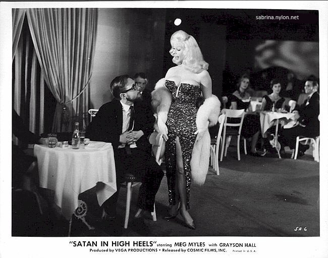 CRITICAL REACTION TO "SATAN IN HIGH HEELS" Thanks to cheesy dialogue, heavy-breathing theatrics and a snazzy S&M production number, the pic is still a kinky way to kill 90 minutes.... Madame Satan trades bitchy barbs with the club's queeny piano player and insults the orthodontically challenged sexpot ( Sabrina ) with whom she shares the bill. The high-heeled hellion also finds time to take a pristine nude swim, commit father/son adultery and unsuccessfully arrange a murder-for-hire plot. Satan in High Heels unfortunately failed to launch an avalanche of foot-fetish flicks. Pity, too. Imagine the possibilities: Hellion in High Tops, Vixen in Vans, Kitten in Clogs, Minx in Mukluks. . . . " |