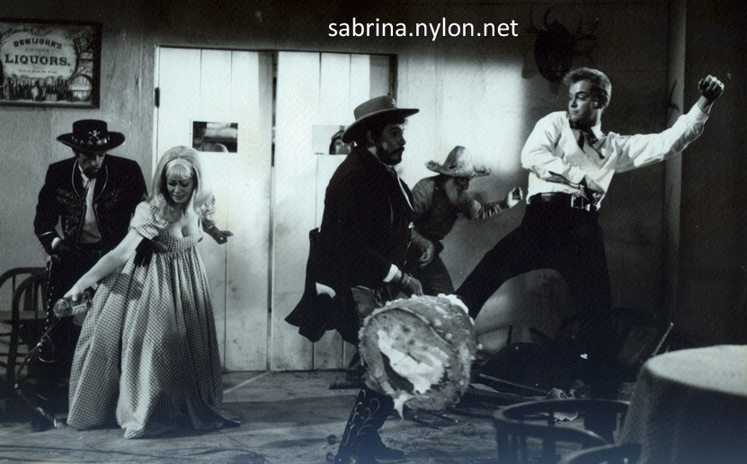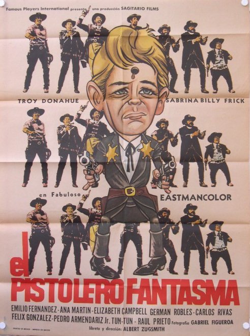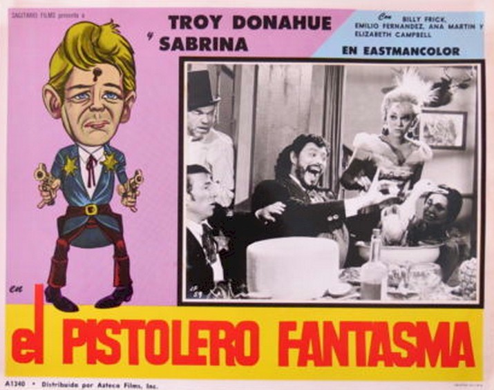 Adapted from source: http://www.wam.umd.edu/~dwilt/fantpist.htm [Famous Players International-Sagitario Films, 1967 ] Director: Albert Zugsmith; Screenplay: Albert Zugsmith, Blair Robertson; Photography: Gabriel Figueroa CAST: Troy Donahue (Bill), Sabrina (Margie), Elizabeth Campbell (Cookie), Emilio Fernández (sheriff), Carlos Rivas (Sam), Germán Robles (the Devil), Pedro Armendáriz Jr. (Algernon) , Billy Frick, Carlos Riquelme, René Ruiz "Tun Tun," Stillman Segar, Ellen Cole. This was one of Albert Zugsmith's two Mexican-made films. The Phantom Gunslinger brought in a few Hollywood actors (Donahue, Sabrina , Billy Frick) and was released in English-language and Spanish-language versions. García Riera says The Phantom Gunslinger was never released in the U.S. The Phantom Gunslinger is set in the town of Tucca Flats. The peaceful life of the town is disrupted by the arrival of a gang of bandits, including Algernon, Big Sam, Cookie, and some others. The sheriff leaves town, but not before naming Bill as his successor. Bill, unfortunately, doesn't carry or even know how to use a gun, and the outlaws take over Tucca Flats. But with the help of some Indians, a suit of armor, and springs on his shoes, Bill manages to run the gang out of town. The wedding of Bill and Margie is underway when the outlaws return; Margie is kidnapped and Bill is shot and killed. He goes to heaven, and is sent back down to Earth. Back on Earth, Bill and one of the outlaws kill each other, and Bill goes back to heaven! Once more he is given back his life and sent down to Tucca Flats. This time, he is "arrested" and put in jail by outlaw Cookie, who is revealed to be a woman when she and Bill kiss. Bill escapes from jail and a general melee ensues. The outlaws, Bill, and Margie all fall into an "infernal cave", where it develops that one of the outlaws is the Devil! But an explosion sends Bill, Margie, and Cookie up to heaven. For now, The Phantom Gunslinger has to be considered a "lost" film, but I am hopeful someone out there will prove me wrong and turn up a copy! |