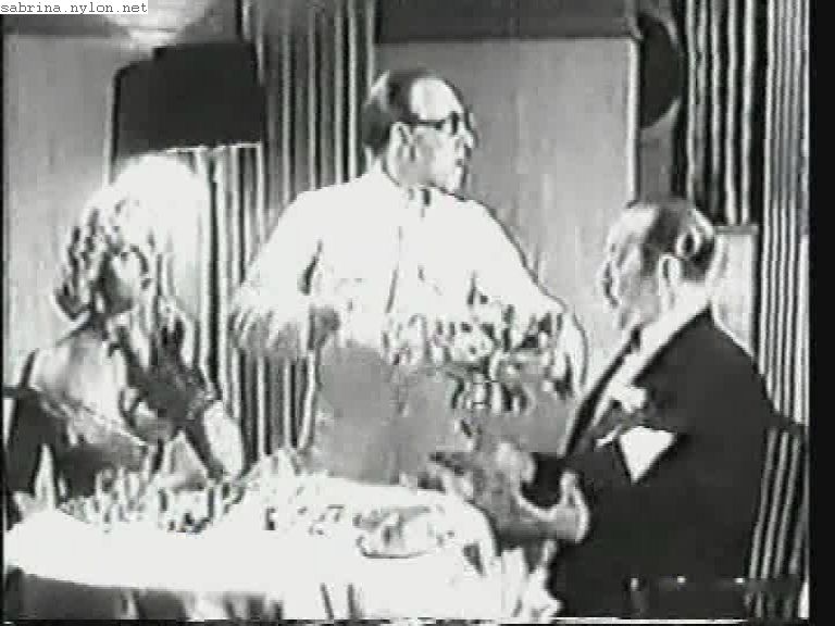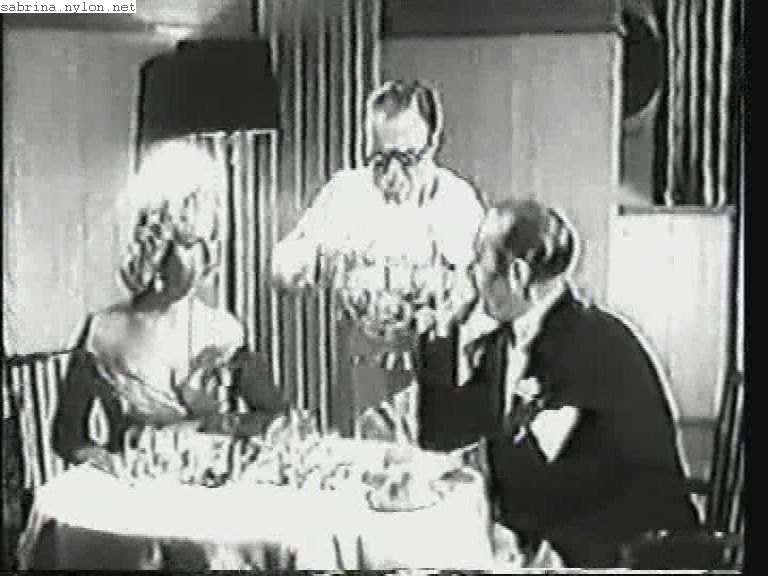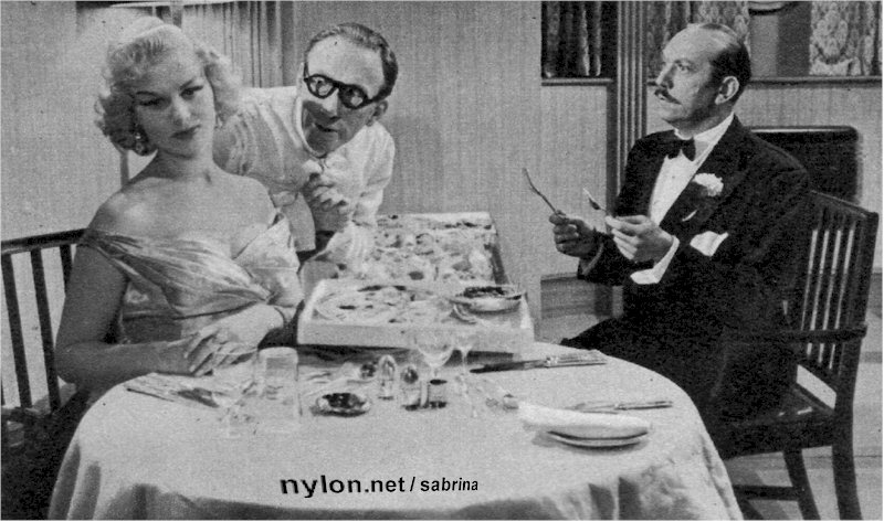 The original text with this picture reads: "Waiter Arthur Askey tries to tempt guest Sabrina while her escort, Campbell Singer, visibly disapproves of his manner in this scene from the British Lion film Ramsbottom Rides Again."