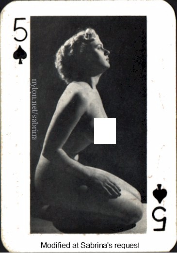 The nudes are used to decorate the back of playing cards widely sold in this country [England] and abroad. Sabrina, who gained a reputation as a pin-up girl by posing in plunging neckline gowns, was silent about the disclosure of her model past.