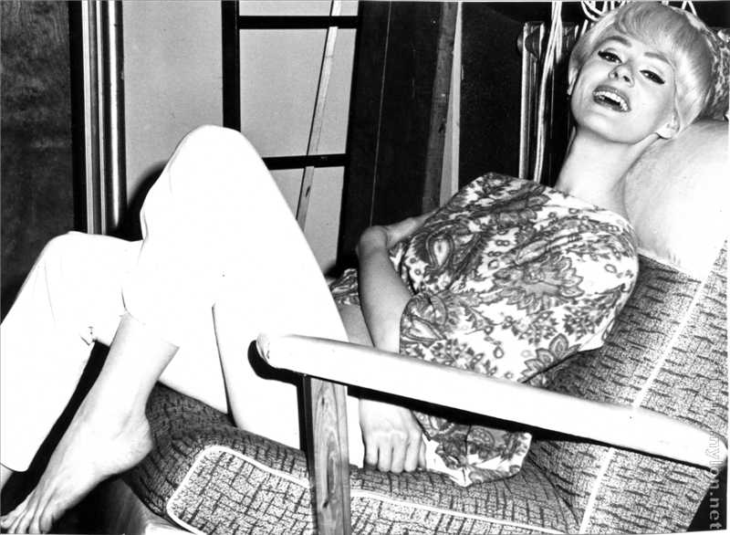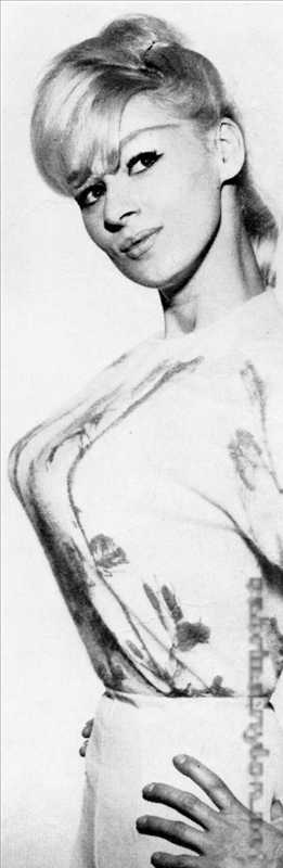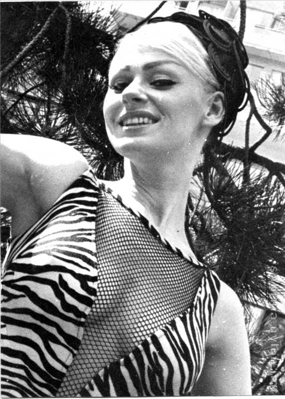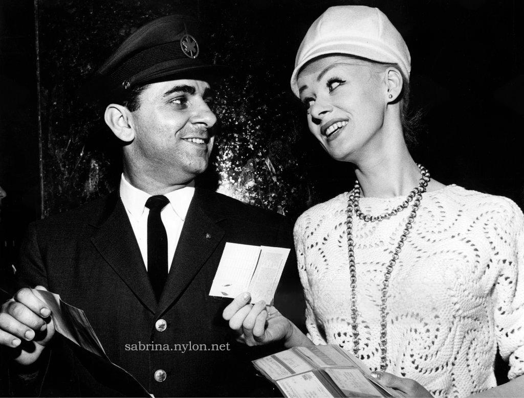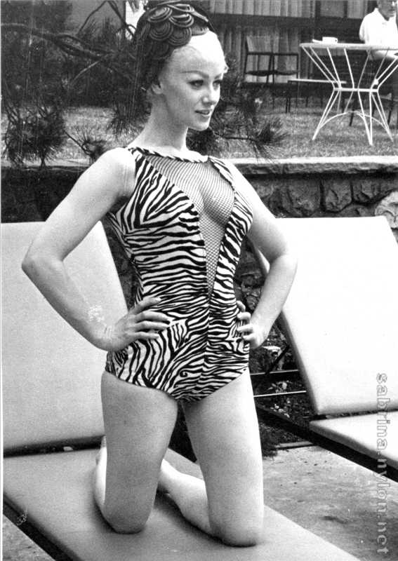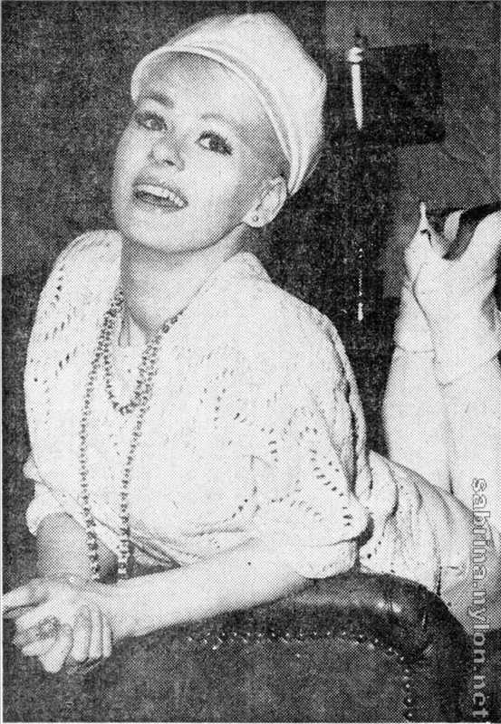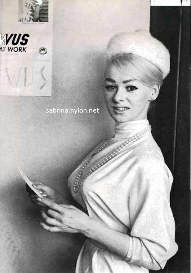 The 23-year-old Sabrina made a striking figure in her flannel jockey cap, skin-tight white slacks, high heeled boots, white crocheted pull-over blouse and zebra jacket.