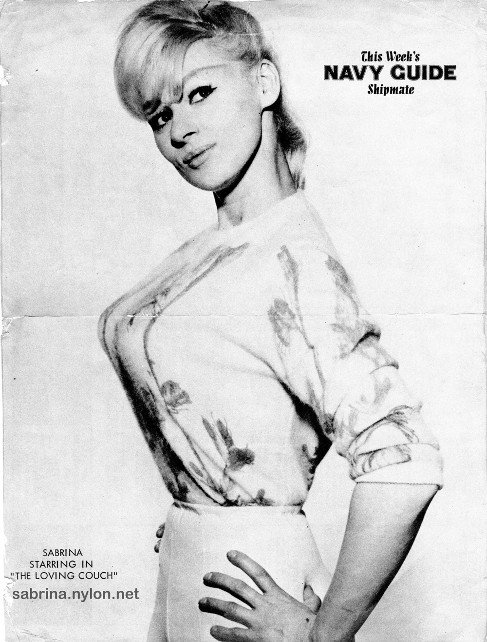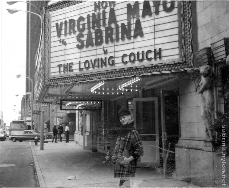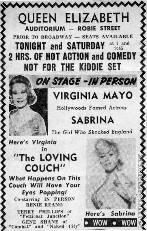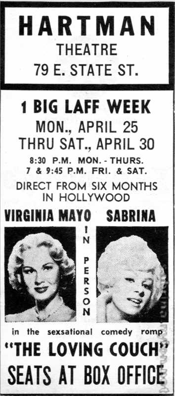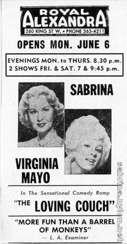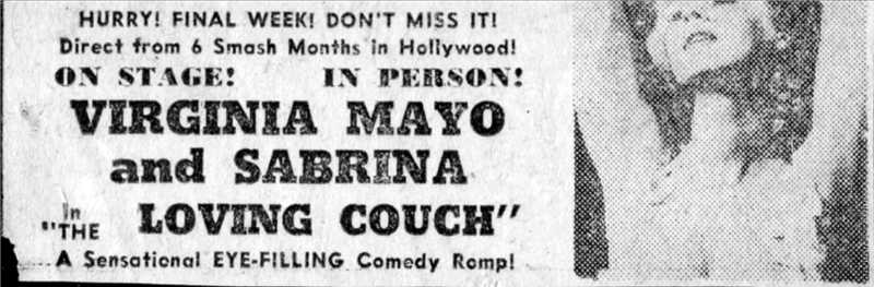 "The Loving Couch" stars Virginia Mayo, most popular of Hollywood stars, known for her score of motion pictures. Co-starring with Miss Mayo, fondly known as "England's Favorite Playgirl," is Sabrina, who was last seen in St. Louis in the perennial comedy "Pajama Tops."