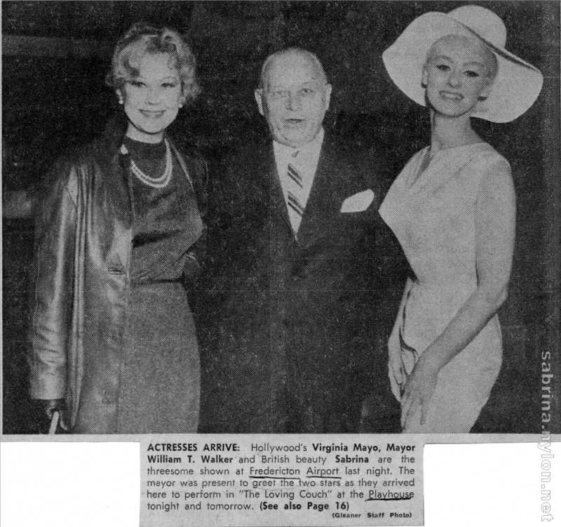 "ACTRESSES ARRIVE: Hollywood's Virginia Mayo , Mayor William T. Walker and British beauty Sabrina are the threesome shown at Fredericton Airport last night. The mayor was present to greet the two stars as they arrived here to perform in "The Loving Couch" at the Playhouse tonight and tomorrow (see also page 16)"