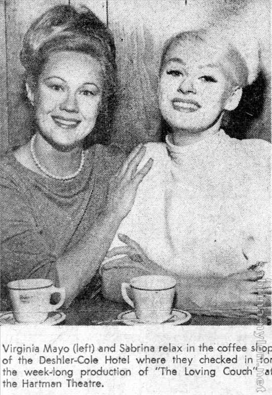 Virginia Mayo (left) and Sabrina relax in the coffee shop of the Deshler-Cole Hotel where they checked in for the week-long production of "The Loving Couch" at the Hartman Theatre.