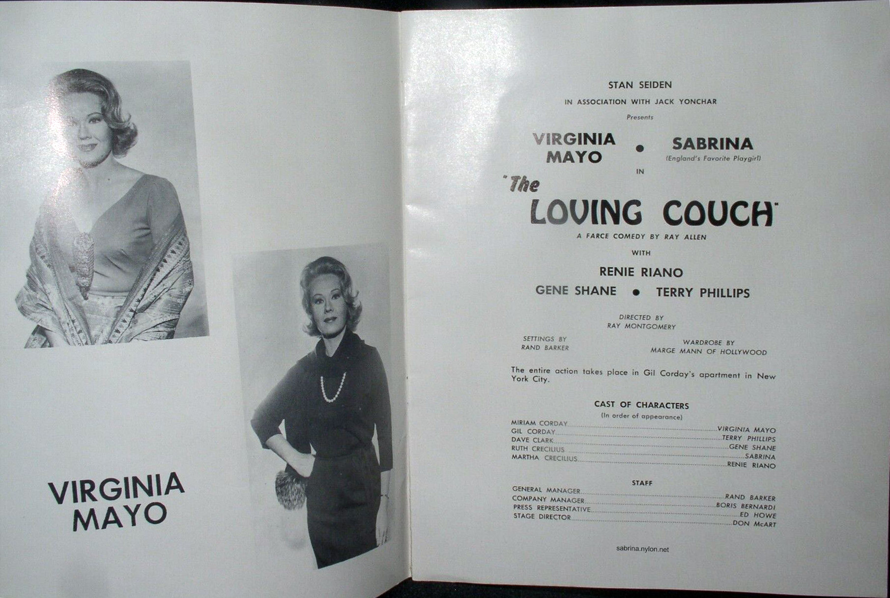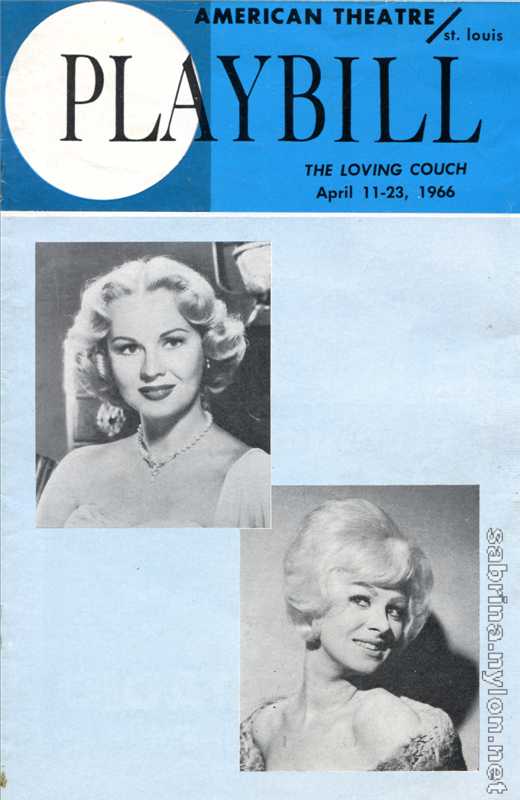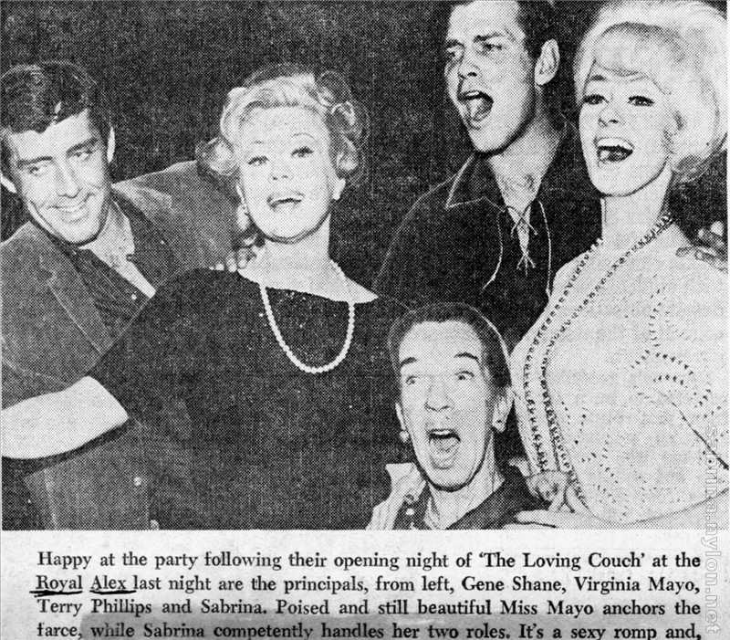 "The Loving Couch" by Ray Allen, presented by Stan Seiden in association with Jack Yonchar. With Virginia Mayo, Sabrina, Renie Riano, Gene Shane and Terry Phillips. Directed by Ray Montgomery. Costumes by Marge Mann of Hollywood.