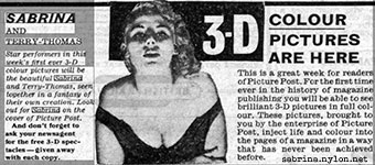 If you want to see more of this Manchester born beauty look in on television's Arthur Askey show 'Before Your Very Eyes' on Friday 18 February 1955. She is Sabrina, an eighteen year old whose vital statistics are bust 39, waist 24 and hips 37. Sabrina had polio at the age of 12, and was in and out of hospital for four years. She started a modelling and cover girl career when she was 17 and is now looking forward to a television future. 14 February 1955