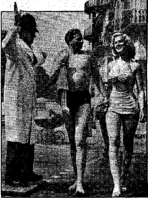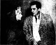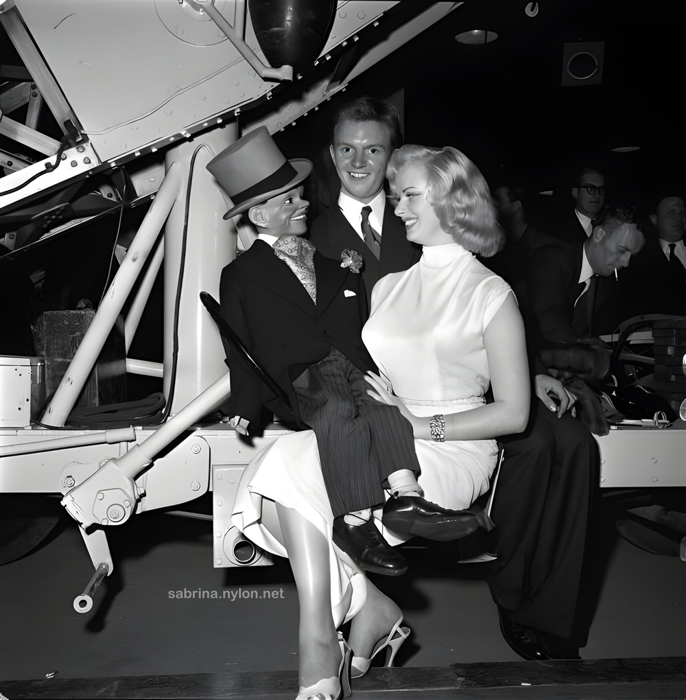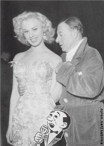 Plain Norma Sykes, 21-year-old Manchester girl, took the stage name Sabrina and her measurements - 39-24-37 - to Arthur Askey (background), and is now a featured player in Askey's TV show "Before Your Very Eyes."