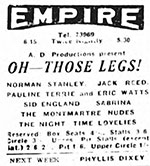Empire — Norman Stanley is a versatile comic in "Oh Those Legs." and receives good support from Pauline Terrie and Eric Watts, Sabrina , Jack Reed, Sid England, Nareda's Girls Carillon Choir, Joan Hall, and the Night Time Lovelies.
